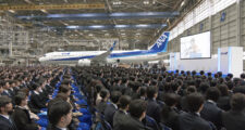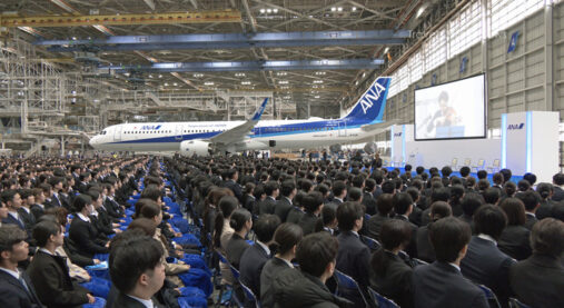 ANAが羽田空港の格納庫で入社式