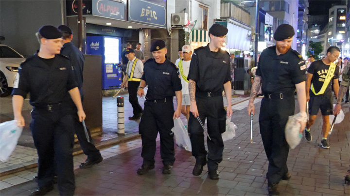 英国海軍空母「プリンス・オブ・ウェールズ」を含む空母打撃群の乗組員が、2025年8月22日、横須賀市で30年以上続く地域防犯・美化活動「基地周辺巡回パトロール」にボランティアとして参加しました。