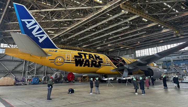 2026年1月10日、ANAは羽田空港の格納庫で「ANA STAR WARS PROJECT」のファイナル・イベントを開催しました。イベントでは、1月9日に運航を終了した特別塗装機「C-3PO ANA JET」の実機を間近で見学することができました。イベントの参加者は、ANAマイレージクラブ会員を対象とした1万人強の応募者の中から幸運にも選ばれた40組80人です。「C-3PO ANA JET」の近くには、既に運航を終了している「R2-D2 ANA JET」と「BB-8 ANA JET」のモデルプレーンも展示されていました。